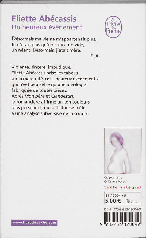 Violent, sincère, impudique, le nouveau roman d’Eliette Abécassis brise les tabous sur la maternité, cet «heureux événement» qui n’est peut-être qu’une idéologie fabriquée de toutes pièces. Après Mon père et Clandestin, la romancière affirme un ton toujours plus personnel, où la fiction se mêle à une analyse subversive de la société.