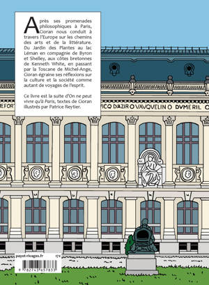 Après ses promenades philosophiques à Paris, Cioran nous conduit à travers l'Europe sur les chemins des arts et de la littérature. Du Jardin des Plantes au lac Léman en compagnie de Byron et Shelley, aux côtes bretonnes de Kenneth White, en passant par le la Toscane de Michel-Ange, Cioran égraine ses réflexions sur la culture et la société comme autant de voyages de l'esprit. Ce livre est la suite d'On ne peut vivre qu'à Paris, textes inédits de Cioran illustrés par Patrice Reytier.