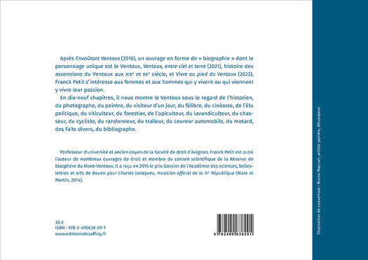 Après Envoûtant Ventoux (2016), un ouvrage en forme de « biographie » dont le personnage unique est le Ventoux, Ventoux, entre ciel et terre (2021), histoire des ascensions du Ventoux aux XIXe et XXe siècle, et Vivre au pied du Ventoux (2022), Franck Petit s’intéresse aux femmes et aux hommes qui y vivent ou qui viennent y vivre leur passion. En dix-neuf chapitres, il nous montre le Ventoux sous le regard de l’historien, du photographe, du peintre, du visiteur d’un jour, du félibre, du cinéaste, de l’élu politique, du viticulteur, du forestier, de l’apiculteur, du lavandiculteur, du chasseur, du cycliste, du randonneur, du traileur, du coureur automobile, du motard, des faits divers, du bibliographe.