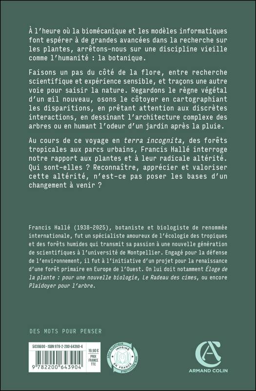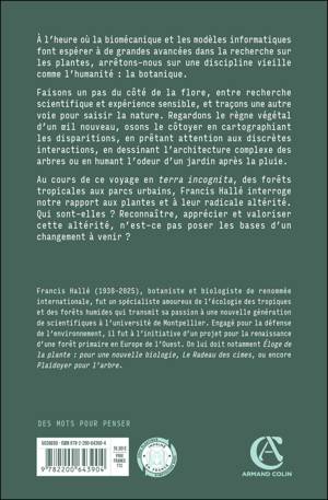 Au cours de ce voyage en terra incognita, des forêts tropicales aux parcs urbains, Francis Hallé interroge notre rapport aux plantes et à leur radicale altérité. Qui sont-elles ? Reconnaître, apprécier et valoriser cette altérité, n’est-ce pas poser les bases d’un changement à venir ?