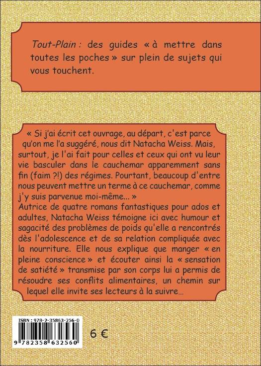 "Si j’ai écrit cet ouvrage, au départ, c'est parce qu’on me l’a suggéré, nous dit Natacha Weiss. Mais, surtout, je l'ai fait pour celles et ceux qui ont vu leur vie basculer dans le cauchemar apparemment sans fin (faim_?!) des régimes. Pourtant, beaucoup d'entre nous peuvent mettre un terme à ce cauchemar, comme j'y suis parvenue moi-même..." Autrice de quatre romans fantastiques pour ados et adultes, Natacha Weiss témoigne ici avec humour et sagacité des problèmes de poids qu'elle a rencontrés dès l'adolescence et de sa relation compliquée avec la nourriture. Elle nous explique que manger "en pleine conscience" et écouter ainsi la "sensation de satiété" transmise par son corps lui a permis de résoudre ses conflits alimentaires, un chemin sur lequel elle invite ses lecteurs à la suivre… - Guide basé sur le témoignage de l'auteur et illustré par Matt7ieu Radenac, public adulte