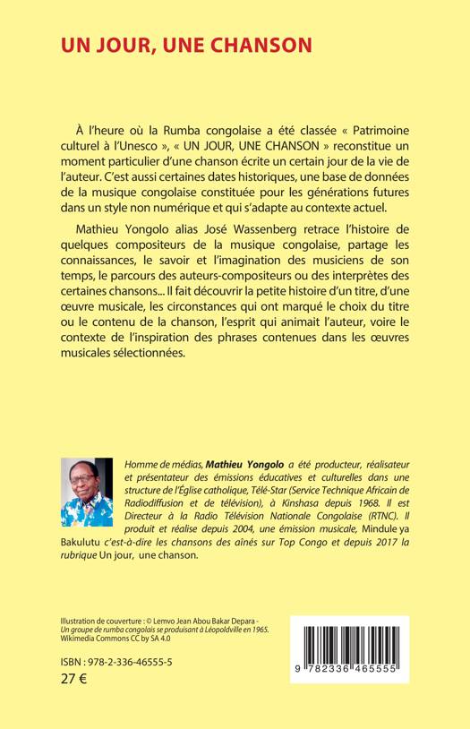 A l'heure où la Rumba congolaise a été classée Patrimoine culturel à l'Unesco, UN JOUR, UNE CHANSON reconstitue un moment particulier d'une chanson écrite un certain jour de la vie de l'auteur. C''est aussi certaines dates historiques, une base de données de la musique congolaise constituée pour les générations futures dans un style non numérique et qui s'adapte au contexte actuel. Mathieu YONGOLO alias José Wassenberg retrace l'histoire de quelques compositeurs de la musique congolaise, partage les connaissances, le savoir et l'imagination des musiciens de son temps, le parcours des auteurs-compositeurs ou des interprètes des certaines chansons...Il fait découvrir la petite histoire d'un titre, d'une oeuvre musicale, les circonstances qui ont marqué le choix du titre ou le contenu de la chanson, l'esprit qui animait l'auteur, voire le contexte de l'inspiration des phrases contenues dans les oeuvres musicales sélectionnées