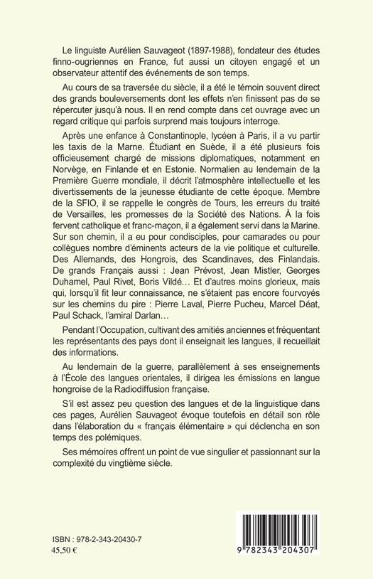 Le linguiste Aurélien Sauvageot (1897-1988), fondateur des études finno-ougriennes en France, fut aussi un citoyen engagé et un observateur attentif des événements de son temps. Au cours de sa traversée du siècle, il a été le témoin souvent direct des grands bouleversements dont les effets n'en finissent pas de se répercuter jusqu'à nous. Il en rend compte dans cet ouvrage avec un regard critique qui parfois surprend mais toujours interroge. S'il est assez peu question des langues et de la linguistique dans ces pages, Aurélien Sauvageot évoque toutefois en détail son rôle dans l'élaboration du « français élémentaire » qui déclencha en son temps des polémiques. Ses mémoires offrent un point de vue singulier et passionnant sur la complexité du vingtième siècle.