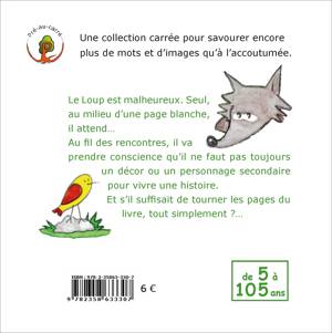 Dans la collection Pré-au-carré : une collection carrée pour savourer encore plus de mots et d’images qu’à l’accoutumée. - Le Loup est malheureux. Seul, au milieu d’une page blanche, il attend… Au fil des rencontres, le Loup va prendre conscience qu’il ne faut pas toujours un décor ou un personnage secondaire pour vivre une histoire. Et s’il suffisait de tourner les pages du livre, tout simplement ?… - Cette histoire du Loup commence à la manière des contes traditionnels détournés à maintes reprises par les auteurs jeunesse, mais Erwan Bargain va beaucoup plus loin. Il invite le loup à se remettre en question… et en scène pour notre plus grand plaisir de lecteur ! De 5 à 105 ans