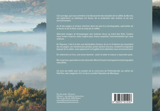 Ce livre suit les tumultes d’une rivière, le Burnot, depuis ses sources jusqu’à la confluence avec la Meuse. À la fois coup de cœur et signal d’alarme, l’exploration de cette vallée interroge notre relation à la nature. Le récit s’écoule tranquillement, faisant la part belle à plus de 200 photos de qualité, qui sont autant de facettes d’une même vallée. Photographe naturaliste, conseiller en biodiversité et environnementaliste engagé, Michel Fautsch vous emmène à ses côtés pour une découverte intense et surprenante d’une vallée méconnue.