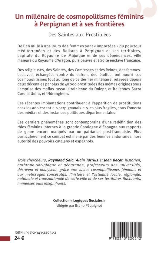 De l’an mille à nos jours des femmes sont « importées » du pourtour méditerranéen et des Balkans à Perpignan et ses territoires. Des religieuses, des Saintes, des Comtesses et des Reines, des femmes esclaves, échangées contre du safran, des étoffes, ont nourri ces cosmopolitismes tout au long de ce dernier millénaire, relayées depuis deux décennies par plus de 40 000 prostituées des mêmes origines sous l’emprise des mafias russo-ukrainienne et italiennes. Ces récentes implantations contribuent à l’apparition de prostitutions chez les adolescent-e-s perpignanais-e-s les plus fragiles, sous l’omerta des médias et des instances politiques départementales. Ces derniers phénomènes sont contemporains d’une redéfinition des rôles féminins internes à la grande Catalogne d’Espagne aux rapports de genre encore marqués par un patriarcat post-franquiste. Plus particulièrement ce combat est mené par des femmes andorranes, hors autorité des pouvoirs catalans et espagnols.