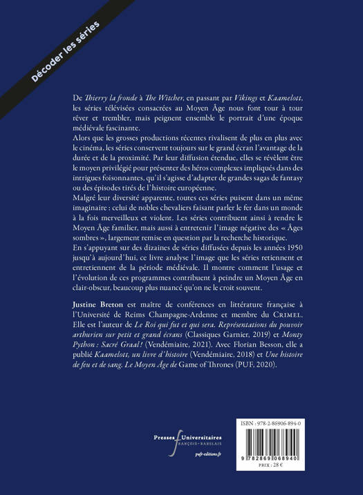 En s'appuyant sur des dizaines de séries diffusées depuis les années 1950 jusqu'à aujourd'hui, ce livre analyse l'image que les séries retiennent et entretiennent de la période médiévale. Il montre comment l'usage et l'évolution de ces programmes contribuent à peindre un Moyen Âge en clair-obscur, beaucoup plus nuancé qu'on ne le croit souvent.