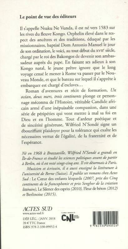 Il s'appelle Nsaku Ne Vunda, il est né vers 1583 sur les rives du fleuve Kongo. Orphelin élevé dans le respect des ancêtres et des traditions, éduqué par les missionnaires, baptisé Dom Antonio Manuel le jour de son ordination, le voici, au tout début du XVIIe siècle, chargé par le roi des Bakongos de devenir son ambassadeur auprès du pape. En faisant ses adieux à son Kongo natal, le jeune prêtre ignore que le long voyage censé le mener à Rome va passer par le Nouveau Monde, et que le bateau sur lequel il s'apprête à embarquer est chargé d'esclaves... Roman d'aventures et récit de formation, Un océan, deux mers, trois continents plonge ce personnage méconnu de l'Histoire, véritable Candide africain armé d'une inépuisable compassion, dans une série de péripéties qui vont mettre à mal sa foi en Dieu et en l'homme. Tout d'ardeur poétique et de sincérité généreuse, Wilfried N'Sondé signe un ébouriffant plaidoyer pour la tolérance qui exalte les nécessaires vertus de l'égalité, de la fraternité et de l'espérance.