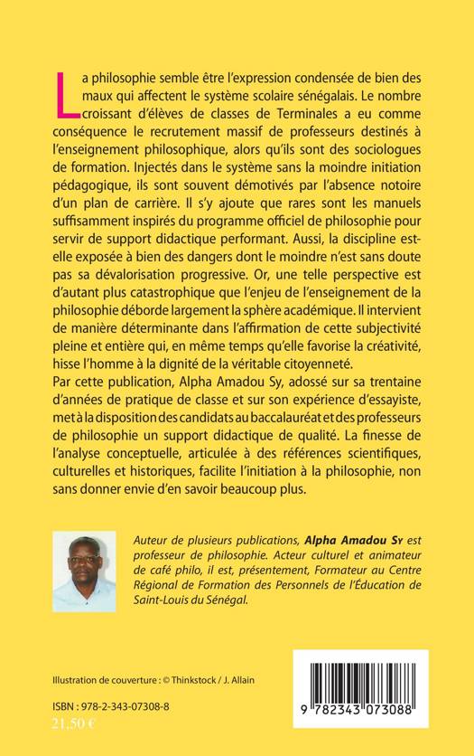 L’enseignement de la philosophie au Sénégal est aujourd’hui menacé alors même que cette matière intervient de façon déterminante dans l’affirmation de soi et la construction d’une véritable citoyenneté. L’auteur met à la disposition des candidats au baccalauréat et des professeurs de philosophie un support didactique de qualité. La finesse de l’analyse conceptuelle, articulée à des références scientifiques, culturelles et historiques, facilite l’initiation à la philosophie, non sans donner envie d’en savoir beaucoup plus.
