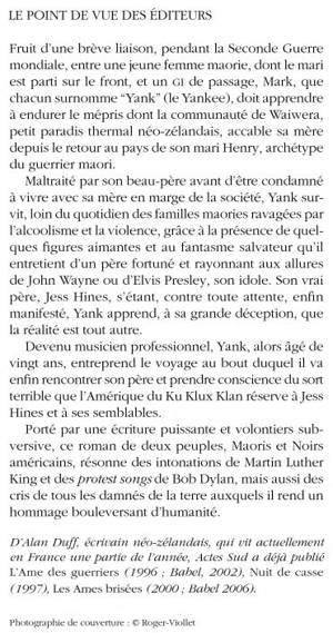 Porté par une écriture puissante et volontiers subversive, ce roman de deux peuples, Maoris et Noirs américains, résonne des intonations de Martin Luther King et des« protest songs» de Bob Dylan, mais aussi des cris de tous les damnés de la terre auxquels il rend un hommage bouleversant d'humanité.