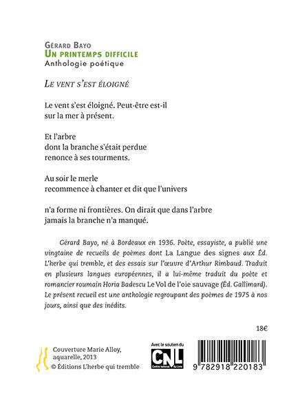 Un recueil de poèmes publiés entre 1975 et aujourd'hui, avec des inédits. Le difficile retour à la vie qu'accompagne le printemps après un rude hiver, lourd de souffrances ; chaque existence éphémère perdue dans l'histoire de l'humanité, en sont les thèmes principaux.