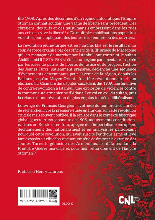 L’ouvrage de François Georgeon, synthèse de nombreuses années de recherches, livre la première étude en français sur cette révolution cruciale mais souvent oubliée. Il la replace dans le contexte historique global (guerre russo-japonaise de 1905, mouvements constitutionnalistes en Russie et en Iran, apogée de l’impérialisme européen, déchaînement des nationalismes) et en analyse les paradoxes : pourquoi cette révolution, qui avait suscité l’enthousiasme et levé tant d’espoirs a-t-elle débouché sur une série de drames : la dictature des Jeunes Turcs, le génocide des Arméniens, les défaites dans la Première Guerre mondiale et, pour finir, l’effondrement de l’Empire ottoman ?