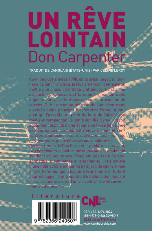 Au milieu des années 1980, dans la banlieue pavillonnaire de San Francisco, le rêve américain demeure un mythe que chacun s'efforce d'atteindre. Le charme de Jackie Jeminovski et la superbe maison dans laquelle elle vit la font passer pour l'incarnation du succès. Cette ancienne hôtesse de l'air désormais divorcée peine pourtant à combattre l'ennui quotidien qui l'assaille, au point de faire de l'alcool son meilleur compagnon. Quant à son fils Derek, il subit également le poids d'une époque où l'idée de l'échec semble bannie. Enchaînant mauvais choix et rencontres douteuses, il se retrouve pris dans les filets d'événements qui le dépasseront rapidement. Dernier roman de Don Carpenter publié de son vivant, Un rêve lointain constitue une émouvante et troublante synthèse de son oeuvre. Peuplant son texte de personnages inoubliables et attachants, il fait preuve d'une indéfectible empathie à l'égard de ces femmes et ces hommes qui, chacun à leur manière, luttent pour échapper à une spirale d'insatisfaction, faisant ainsi craquer le vernis d'une société pétrie de conventions et d'illusions.