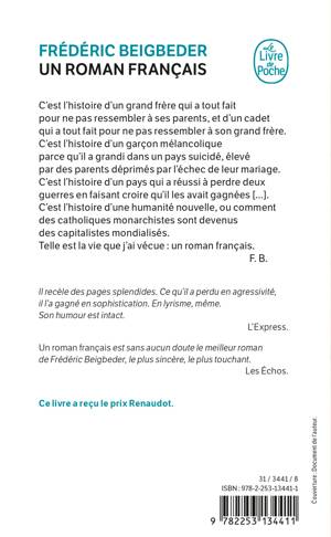 C'est l'histoire d'un grand frère qui a tout fait pour ne pas ressembler à ses parents, et d'un cadet qui a tout fait pour ne pas ressembler à son grand frère. C'est l'histoire d'un garçon mélancolique parce qu'il a grandi dans un pays suicidé, élevé par des parents déprimés par l'échec de leur mariage. C'est l'histoire d'un pays qui a réussi à perdre deux guerres en faisant croire qu'il les avait gagnées [...]. C'est l'histoire d'une humanité nouvelle, ou comment des catholiques monarchistes sont devenus des capitalistes mondialisés. Telle est la vie que j'ai vécue: un roman français. F. B.Ce livre a reçu le Prix Renaudot.Il recèle des pages splendides. Ce qu'il a perdu en agressivité, il l'a gagné en sophistication. En lyrisme, mème. [...] son humour est intact. L'Express.Un roman français est sans aucun doute le meilleur roman de Frédéric Beigbeder, le plus sincère, le plus touchant. Les Échos.
