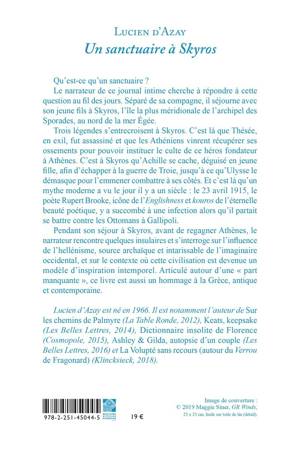 Qu'est-ce qu'un sanctuaire ? Le narrateur de ce journal intime cherche a repondre a cette question au fil des jours. Separe de sa compagne, il sejourne avec son jeune fils a Skyros, l'ile la plus meridionale de l'archipel des Sporades, au nord de la mer Egee. Trois legendes s'entrecroisent a Skyros. C'est la que Thesee, en exil, fut assassine et que les Atheniens vinrent recuperer ses ossements pour pouvoir instituer le culte de ce heros fondateur a Athenes. C'est a Skyros qu'Achille se cache, deguise en jeune fille, afin d'echapper a la guerre de Troie, jusqu'a ce qu'Ulysse le demasque pour l'emmener combattre a ses cotes. Et c'est la qu'un mythe moderne a vu le jour il y a un siecle: le 23 avril 1915, le poete Rupert Brooke, icone de l'Englishness et kouros de l'eternelle beaute poetique, y a succombe a une infection alors qu'il partait se battre contre les Ottomans a Gallipoli. Pendant son sejour a Skyros, avant de regagner Athenes, le narrateur rencontre quelques insulaires et s'interroge sur l'influence de l'hellenisme, source archaique et intarissable de l'imaginaire occidental, et sur le contexte ou cette civilisation est devenue un modele d'inspiration intemporel. Articule autour d'une part manquante , ce livre est aussi un hommage a la Grece, antique et contemporaine.
