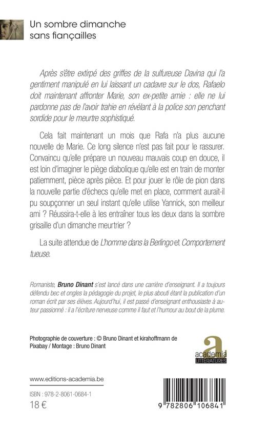 Un sombre dimanche sans fiançailles, le final de la trilogie policière de Bruno Dinant. Un délicieux cocktail déconcertant, qui se démarque par son humour subtil et discret, son univers bien ancré dans notre terroir, son intrigue habilement ficelée dans laquelle le lecteur se laisse balancer de révélations en rebondissements avec une évidente délectation.