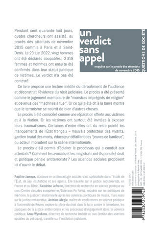 Pendant cent quarante-huit jours, quatre chercheurs ont assisté au procès des attentats de novembre 2015 commis à Paris et à Saint- Denis. Le 29 juin 2022, vingt hommes ont été déclarés coupables ; 2 318 femmes et hommes ont ensuite été confirmés dans leur statut juridique de victimes. Le verdict n'a pas été contesté. Ce livre propose une lecture inédite du déroulement de l'audience et déconstruit l'évidence du récit judiciaire. Le procès a été présenté comme le jugement exemplaire de "monstres imprégnés de religion" et devenus des "machines à tuer". Or ce qui a été dit à la barre montre que le terrorisme se nourrit de bien d'autres choses. Le procès a été considéré comme une réparation offerte aux victimes et à la Nation. Or les victimes ont surtout été invitées à exposer leurs traumatismes. Certaines d'entre elles ont du reste pointé les manquements de l'État français - mauvais protecteur des vivants, gardien brutal des morts, éducateur défaillant des "jeunes de banlieue", ou acteur imprudent sur la scène internationale. Le procès a-t-il permis d'éclairer le processus qui a conduit aux attentats ? Comment les avocats et les magistrats ont-ils pondéré droit et politique pénale antiterroriste ? Les sciences sociales proposent ici d'ouvrir le débat.