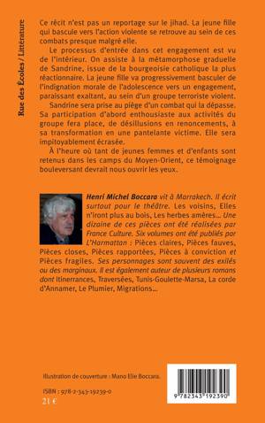 Sandrine, issue de la bourgeoisie catholique, bacule vers l'action violente et se retrouve entraînée, presque malgré elle, dans les combats du jihad . A travers ce récit, nous assistons à la métamorphose graduelle d'une jeune fille qui passe de l'indignation morale de l'adolescence à un engagement en apparence exaltant au sein d'un groupe terroriste.