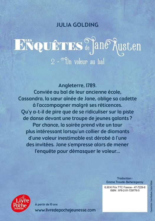 Angleterre 1789. Conviée au bal de leur ancienne école, Cassandra, la sœur de Jane, oblige sa cadette à l'accompagner malgré ses réticences. Qu’y a-t-il de pire que de se ridiculiser sur la piste de danse devant une troupe de jeunes galants ? Par chance, la soirée prend vite un tour plus intéressant lorsqu’un collier de diamants d’une valeur inestimable est dérobé à l’une des invitées. Jane s’empresse alors de mener l’enquête pour démasquer le voleur.