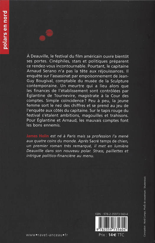 À Deauville, le festival du film américain ouvre bientôt ses portes. Cinéphiles, stars et politiques préparent ce rendez-vous incontournable. Pourtant, le commissaire Arnaud Serano n’a pas la tête aux réjouissances. Il enquête sur l’assassinat par empoisonnement de Jean-Guy Bougival, comptable du musée de la sculpture contemporaine. Un meurtre qui a lieu alors que les finances de l’établissement sont contrôlées par Églantine de Tournevire, magistrate à la Cour des comptes. Simple coïncidence ? Peu à peu, Tournevire sort le nez des chiffres et se prend au jeu de l’enquête aux côtés de Serano. Sur le tapis rouge du festival s’étalent ambitions, magouilles et trahisons. Pour Églantine et Arnaud, les mauvais comptes font les bons ennemis.