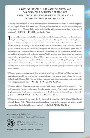 The prescient, page-turning account of a journey in Silicon Valley: a defining memoir of our digital age In her mid-twenties, at the height of tech industry idealism, Anna Wiener--stuck, broke, and looking for meaning in her work, like any good millennial--left a job in book publishing for the promise of the new digital economy. She moved from New York to San Francisco, where she landed at a big-data startup in the heart of the Silicon Valley bubble: a world of surreal extravagance, dubious success, and fresh-faced entrepreneurs hell-bent on domination, glory, and, of course,
