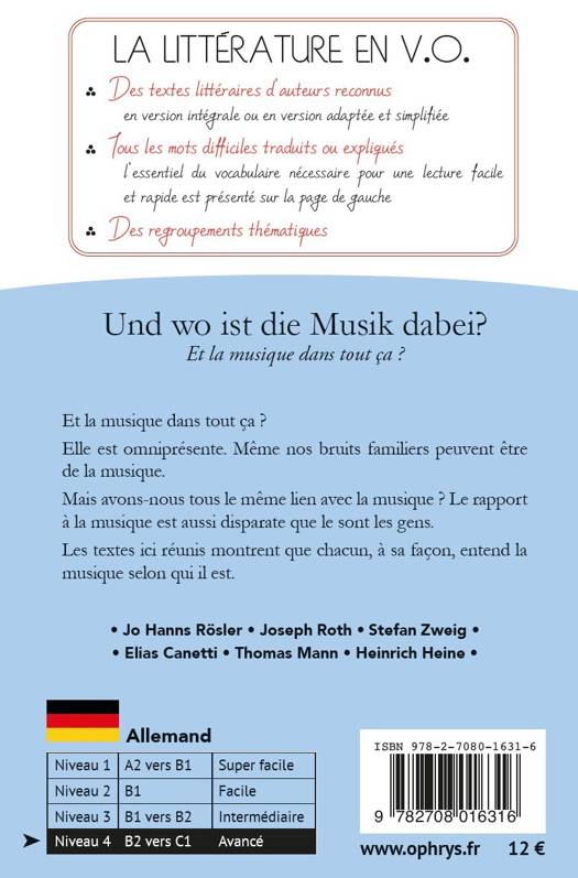 Et la musique dans tout ça ? Elle est omniprésente. Même nos bruits familiers peuvent être de la musique. Mais avons-nous tous le même lien avec la musique ? Le rapport à la musique est aussi disparate que le sont les gens. Les textes ici réunis montrent que chacun, à sa façon, entend la musique selon qui il est. Les extraits seront tirés des oeuvres de Jo Hanns Rösler, Joseph Roth, Stefan Zweig, Elias Canetti, Thomas Mann, et Heinrich Heine. La collection "Histoires faciles à lire" s’adresse à tous ceux qui ont envie de lire des textes littéraires en version originale. Les ouvrages regroupent par thèmes les textes d’auteurs connus et reconnus dans chacune des langues proposées. Les textes sont présentés sur la page de droite en version intégrale ou en version adaptée et simplifiée. L’essentiel du vocabulaire nécessaire est traduit sur la page de gauche pour une lecture facile, rapide et autonome. Chaque histoire est accompagnée d’un court appareil pédagogique à utiliser en classe ou en autonomie.