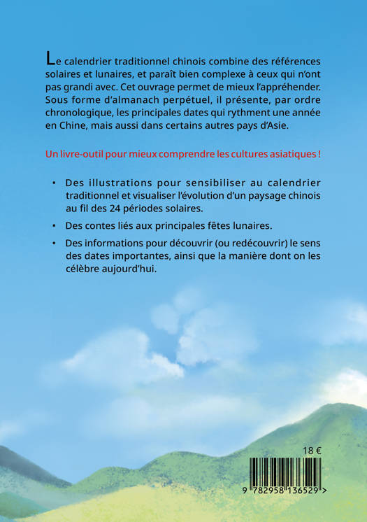 - des illustrations pour sensibiliser au calendrier traditionnel et visualiser l'évolution d'un paysage chinois au fil des 24 périodes solaires. - des contes liés aux principales fêtes lunaires. - des informations pour découvrir (ou redécouvrir) le sens des dates importantes; ainsi que la manière dont on les célèbre aujourd'hui.