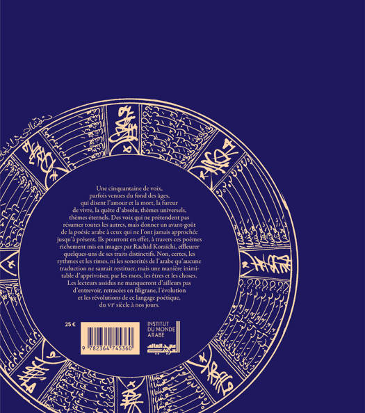 Cet ouvrage bilingue franco-arabe regroupe trois recueils d'anthologies («Poésie arabe, Poésie algérienne» et «Poésie arabo- andalouse»), superbement illustrés par le grand artiste algérien, Rachid Koraïchi.
