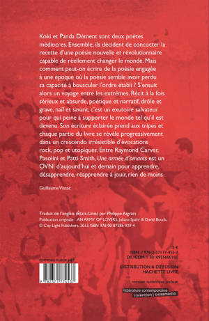 Koki et Panda Dément sont deux poètes médiocres. Ensemble, ils décident de concocter la recette d'une poésie nouvelle et révolutionnaire capable de réellement changer le monde. Mais comment peut-on écrire de la poésie engagée à une époque où la poésie semble avoir perdu sa capacité à bousculer l'ordre établi ? S'ensuit alors un voyage entre les extrêmes. Récit à la fois sérieux et absurde, poétique et narratif, drôle et grave, naïf et savant, c'est un exutoire salvateur pour qui peine à supporter le monde tel qu'il est devenu. Son écriture éclairée prend aux tripes et chaque partie du livre se révèle progressivement dans un crescendo irrésistible d'évocations rock, pop et utopiques. Entre Raymond Carver, Pasolini et Patti Smith, Une armée d'amants est un OVNI d'aujourd'hui et demain pour apprendre, désapprendre, réapprendre à jouir, rien de moins. — Traduit de l'anglais (États-Unis) par Philippe Aigrain