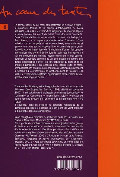 Cet ouvrage trouve son intérêt dans le caractère déchiré de la double autobiographie de Louis Althusser, Les faits et L'avenir dure longtemps. Par ailleurs, ce "corpus" particulier offre l'occasion d'une réflexion sur les rapports riches et complexes, entre archives et genèse, ainsi que sur les rapports libres et contraints entre génétique du texte et linguistique de l'énonciation.