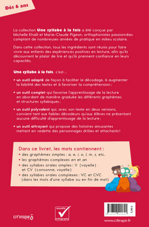 Des textes adaptés pour lire plus facilement ! Pour faciliter l’apprentissage de la lecture, les mots qui composent les histoires ont été sélectionnés en fonction de leur familiarité, de leur structure syllabique et des graphèmes* qu’ils contiennent. Plusieurs adaptations visuelles permettent de réduire la charge cognitive liée au décodage et de limiter l’encombrement perceptif. Les livrets contiennent deux fois la même histoire : dans la première version, syllabes orales, lettres muettes et graphèmes complexes sont mis en relief ; dans la seconde, ces adaptations ne sont pas présentes. Ce sont donc des outils polyvalents qui favorisent le transfert des acquis et qui conviennent à tous les enfants. Les histoires fantaisistes mettent en scène des personnages rigolos et attachants. La trame narrative captive les jeunes lecteurs tout en leur permettant de faire des prédictions. Les illustrations leur donnent aussi de nombreuses occasions de faire des inférences.