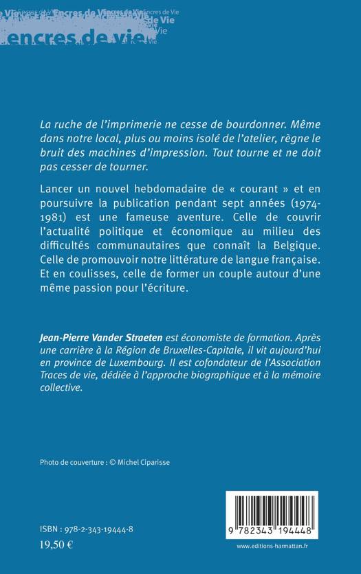 La ruche de l'imprimerie ne cesse de bourdonner. Même dans notre local, plus ou moins isolé de l'atelier, règne le bruit des machines d'impression. Tout tourne et ne doit pas cesser de tourner. Lancer un nouvel hebdomadaire de « courant » et en poursuivre la publication pendant sept années est une fameuse aventure. Celle de couvrir l'actualité politique et économique au milieu des difficultés communautaires que connaît la Belgique. Celle de promouvoir notre littérature de langue française. Et en coulisses, celle de former un couple autour d'une même passion pour l'écriture.
