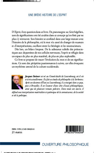 D'Esprit, il est question dans ce livre. Du pneuma grec au Geist hégélien, tant de significations ont été coulées dans ce concept qu'on finit par ne plus s'y retrouver. Ce livre se propose de tracer l'évolution du mot et de ses significations. Ce sont des péripéties passionnantes à suivre, car elles évoquent un mythème central de la culture occidentale.