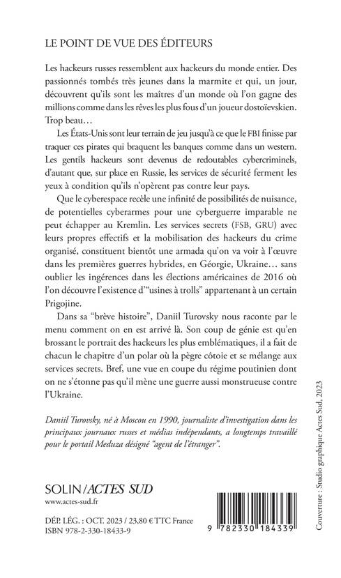 Les hackeurs russes ressemblent aux hackeurs du monde entier. Des passionnés tombés très jeunes dans la marmite et qui, un jour, déc ouvrent qu'ils sont les maîtres d'un monde où l'on gagne des millions comme dans les rêves les plus fous d'un joueur dostoïevskien. Trop beau... Les États-Unis sont leur terrain de jeu jusqu'à ce que le FBI finisse par traquer ces pirates qui braquent les banques comme dans un western. Les gentils hackeurs sont devenus de redoutables cybercriminels, d'autant que, sur place en Russie, les services de sécurité ferment les yeux à condition qu'ils n'opèrent pas contre leur pays. Que le cyberespace recèle une infinité de possibilités de nuisance, de potentielles cyberarmes pour une cyberguerre imparable ne peut échapper au Kremlin. Les services secrets (FSB,GRU) avec leurs propres effectifs et la mobilisation des hackeurs du crime organisé, constituent bientôt une armada qu'on va voir à l'oeuvre dans les premières guerres hybrides, en Géorgie, Ukraine... sans oublier les ingérences dans les élections américaines de 2016 où l'on découvre l'existence d'"usines à trolls" appartenant à un certain Prigojine. Dans sa "brève histoire", Daniil Turovsky nous raconte par le menu comment on en est arrivé là. Son coup de génie est qu'en brossant le portrait des hackeurs les plus emblématiques, il a fait de chacun le chapitre d'un polar où la pègre côtoie et se mélange aux services secrets. Bref, une vue en coupe du régime poutinien dont on ne s'étonne pas qu'il mène une guerre aussi monstrueuse contre l'Ukraine.
