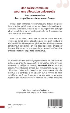 Depuis 2017, en France, l'idée d'un revenu de base progresse dans le débat public tout en se nourrissant de nombreuses réflexions théoriques. L'auteur de cet ouvrage entend partager ici ses convictions sur un mode particulier de financement de cette allocation universelle. Pour lui en effet, seule une séparation nette entre les revenus du travail et une allocation pour tous peut conduire et à la faisabilité et à l'acceptation générale d'un tel changement de paradigme. Il se distingue en cela des propositions émises par d'autres défenseurs du revenu de base, lesquelles s'appuient principalement sur un partage des revenus. En parallèle de se son activité professionnelle de chercheur en milieu carcéral où il a pu constater la corrélation entre précarité matérielle et relégation sociale, Jean-Noël Marzo participe depuis de nombreuses années aux controverses à propos de l'Allocation Universelle. Membre de mouvements (Utopia, MFRB...), il a contribué à la réflexion sur le revenu de base, en affinant, au fil des échanges et de ses lectures, sa propre argumentation sur les avancées réalistes de sa mise en oeuvre.
