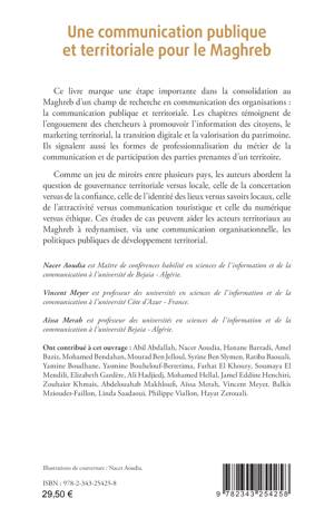 Ce livre marque une étape importante dans la consolidation au Maghreb d’un champ de recherche en communication des organisations : la communication publique et territoriale. Les chapitres témoignent de l’engouement des chercheurs à promouvoir l’information des citoyens, le marketing territorial, la transition digitale et la valorisation du patrimoine. Ils signalent aussi les formes de professionnalisation du métier de la communication et de participation des parties prenantes d’un territoire. Ces études de cas peuvent aider les acteurs territoriaux au Maghreb à redynamiser, via une communication organisationnelle, les politiques publiques de développement territorial.