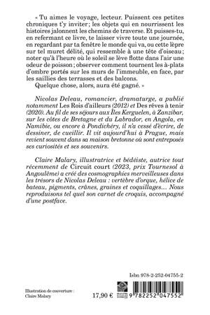 « Tu aimes le voyage, lecteur. Puissent ces petites chroniques t’y inviter ; les objets qui en nourrissent les histoires jalonnent les chemins de traverse. Et puisses-tu, en refermant ce livre, te laisser vivre toute une journée, en regardant par ta fenêtre le monde qui va, ou cette lèpre sur tel muret délité, qui ressemble à une tête d’oiseau ; noter qu’à l’heure où le soleil se lève flotte dans l’air une odeur de poisson ; observer comment tournent les à-plats d’ombre portés sur les murs de l’immeuble, en face, par les saillies des terrasses et des balcons. Quelque chose, alors, aura été gagné. »