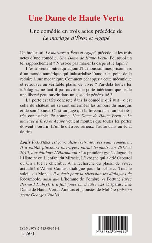 Un bref essai, « Le mariage d'Éros et Agapé », précède ici les trois actes d'une comédie, « Une Dame de Haute Vertu ». L'essai veut montrer qu'aujourd'hui nous sommes prisonniers d'un monde numérique qui industrialise l'amour au point de le réduire à une mécanique. La comédie qui suit est quant à elle l'histoire du château où se sont enfermées les amours du marquis et de son épouse. En somme, ce livre veut montrer que toutes les portes, concrètes ou intérieures, doivent s'ouvrir.