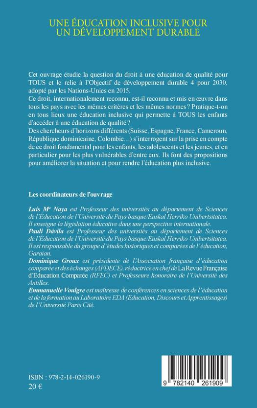 Cet ouvrage étudie la question du droit à une éducation de qualité pour TOUS et le relie à l'Objectif de développement durable 4 pour 2030, adopté par les Nations-Unies en 2015. Ce droit, internationalement reconnu, est-il reconnu et mis en œuvre dans tous les pays avec les mêmes critères et les mêmes normes ? Pratique-t-on en tous lieux une éducation inclusive qui permette à TOUS les enfants d'accéder à une éducation de qualité ? Des chercheurs d'horizons différents (Suisse, Espagne, France, Cameroun, République dominicaine, Colombie...) s'interrogent sur la prise en compte de ce droit fondamental pour les enfants, les adolescents et les jeunes, et en particulier pour les plus vulnérables d'entre eux. Ils font des propositions pour améliorer la situation et pour rendre l'éducation plus inclusive.