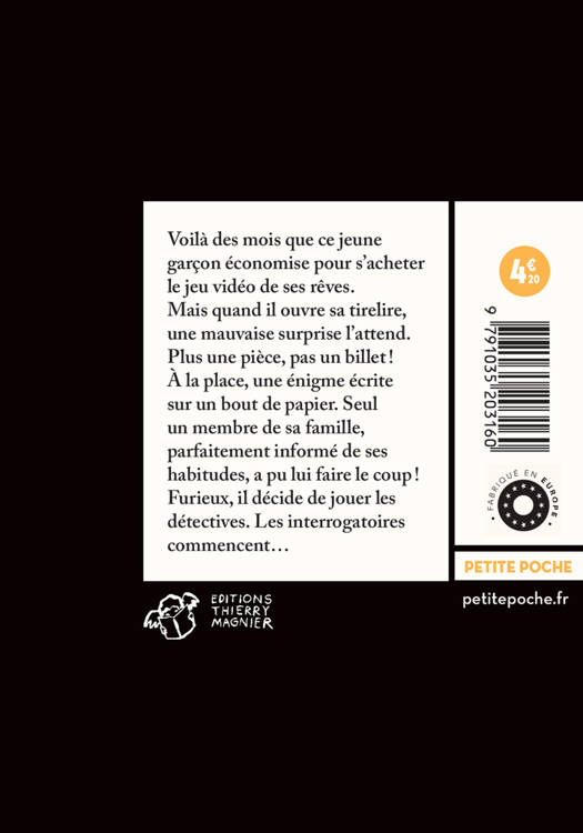 Voilà des mois que le narrateur de ce court roman économise patiemment pour s'acheter le jeu vidéo de ses rêves. Mais quand il ouvre sa tirelire, une mauvaise surprise l'attend : elle est vide ! Plus une pièce, pas un billet. À la place, un morceau de papier lui lance une énigme « Je prends ce qui est précieux, je t'offre ce qui n'a pas de prix. ». Une chose est sûre, seul un membre de son entourage proche, parfaitement informé de ses habitudes, a pu lui faire le coup ! Les interrogatoires commencent...