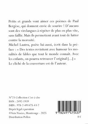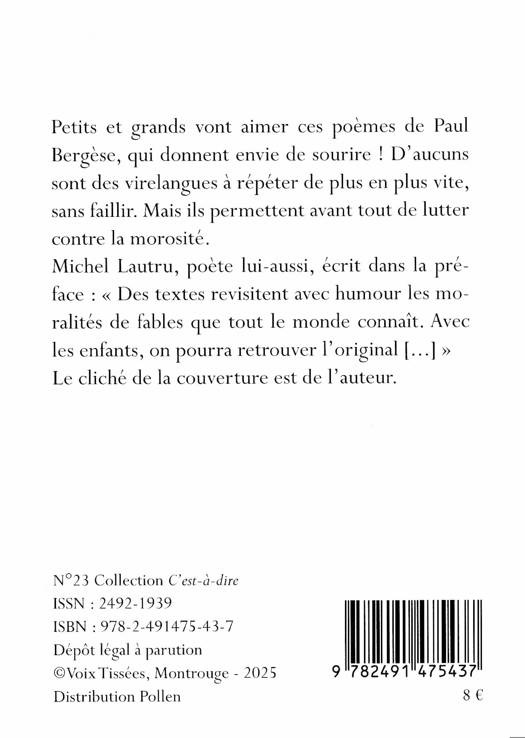 Poèmes à faire sourire, l'auteur Paul Bergèse invite lectrices et lecteurs, à lutter contre la morosité ambiante. Il revisite fables célèbres et virelangues de sa plume, afin de provoquer des sourires. Pour petits et grands, précise dans sa préface Michel Lautru. C'est un petit livre réjouissant à s'offrir, pour partager sourires et mots.