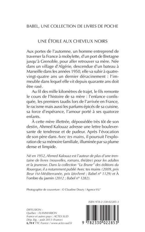 Après «Avec tes mains» (Babel n° 1129, prix Beur FM, prix Léo Ferré), portrait bouleversant de son père Abd el-Kader, Ahmed Kalouaz poursuit son exploration de la mémoire familiale avec une évocation de sa mère. Immigrée d'Algérie dans les années 1950, elle fut toute sa vie une femme soumise aux tâches ménagères, dévouée à ses quatorze enfants, qui jamais ne connut ni insouciance ni bonheur. Alors qu'elle doit quitter l'appartement dans lequel elle a vécu quarante ans, car la cité de Grenoble où il se trouve va être détruite, son fils installé en Bretagne choisit de traverser la France en mobylette pour la retrouver. Le temps de lui écrire une longue lettre d'amour et de mémoire.
