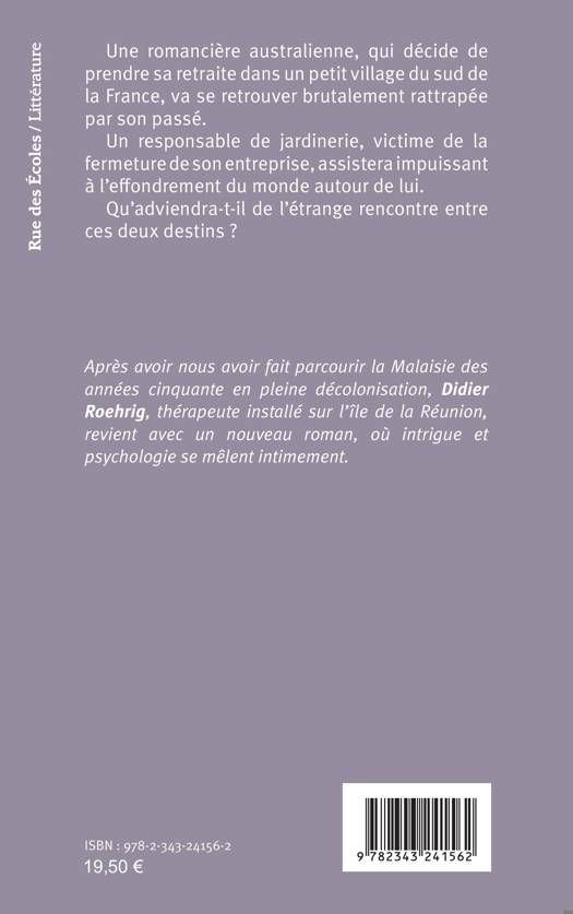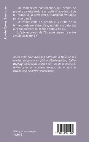 Une romancière australienne, qui décide de prendre sa retraite dans un petit village du sud de la France, va se retrouver brutalement rattrapée par son passé. Un responsable de jardinerie, victime de la fermeture de son entreprise, assistera impuissant à l’effondrement du monde autour de lui. Qu’adviendra-t-il de l’étrange rencontre entre ces deux destins ?