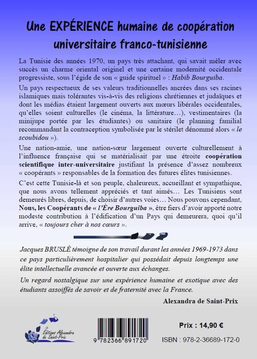La Tunisie des années 1970, un pays très attachant, qui savait mêler avec succès un charme oriental originel et une certaine modernité occidentale progressiste, sous l’égide de son « guide spirituel » : Habib Bourguiba. Un pays respectueux de ses valeurs traditionnelles ancrées dans ses racines islamiques mais tolérantes vis-à-vis des religions chrétiennes et judaïques et dont les médias étaient largement ouverts aux mœurs libérales occidentales, qu’elles soient culturelles (le cinéma, la littérature…), vestimentaires (la minijupe portée par les étudiantes) ou sanitaire (le planning familial recommandant la contraception symbolisée par le stérilet dénommé alors « le scoubidou »). Une nation-amie, une nation-sœur largement ouverte culturellement à l’influence française qui se matérialisait par une étroite coopération scientifique inter-universitaire justifiant la présence d’assez nombreux « coopérants » responsables de la formation des futures élites tunisiennes. C’est cette Tunisie-là et son peuple, chaleureux, accueillant et sympathique, que nous avons tellement appréciés et tant aimés… Les Tunisiens sont demeurés libres, depuis, de choisir d’autres voies… Nous pouvons cependant, Nous, les Coopérants de « l’Ère Bourguiba », être fiers d’avoir apporté notre modeste contribution à l’édification d’un Pays qui demeurera, quoi qu’il arrive, « toujours cher à nos cœurs ». Jacques BRUSLÉ témoigne de son travail durant les années 1969-1973 dans ce pays particulièrement hospitalier qui possédait depuis longtemps une élite intellectuelle avancée et ouverte aux échanges. Un regard nostalgique sur une expérience humaine et exotique avec des étudiants assoiffés de savoir et de fraternité avec la France.