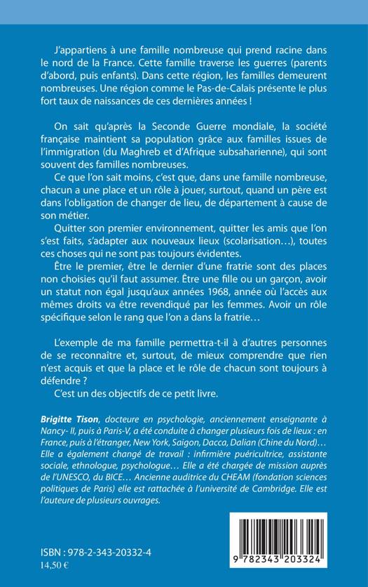Dans le nord de la France, les familles demeurent nombreuses. Une région comme le Pas-de-Calais présente le plus fort taux de naissances de ces dernières années. Dans une famille nombreuse, chacun a une place et un rôle à jouer, surtout quand un père est dans l'obligation de changer de lieu, de département à cause de son métier. Être le premier, être le dernier d'une fratrie sont des places non choisies qu'il faut assumer. Être une fille ou un garçon, avoir un statut non égal jusqu'aux années 1968, année où l'accès aux mêmes droits va être revendiqué par les femmes. Avoir un rôle spécifique selon le rang que l'on a dans la fratrie. A travers l'exemple de sa famille, l'auteure veut montrer que rien n'est acquis et que la place et le rôle de chacun sont toujours à défendre.