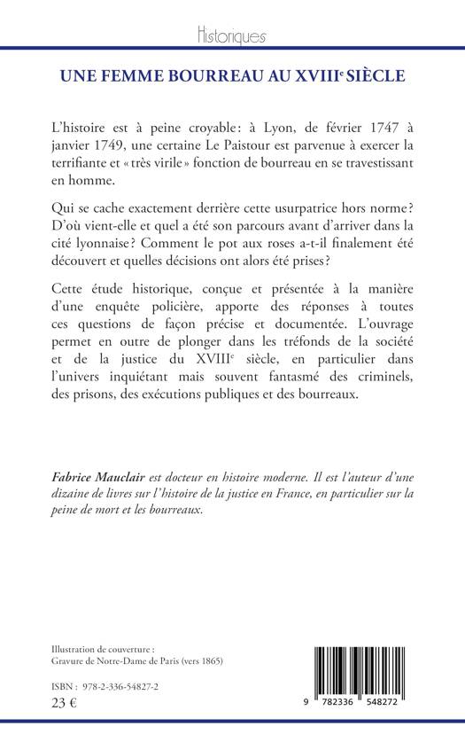 L'histoire est à peine croyable: à Lyon, de février 1747 à janvier 1749, une certaine Le Paistour est parvenue à exercer la terrifiante et très virile fonction de bourreau en se travestissant en homme. Qui se cache exactement derrière cette usurpatrice hors norme ? D'où vient-elle et quel a été son parcours avant d'arriver dans la cité lyonnaise ? Comment le pot aux roses a-t-il finalement été découvert et quelles décisions ont alors été prises ? Cette étude historique, conçue et présentée à la manière d'une enquête policière, apporte des réponses à toutes ces questions de façon précise et documentée. L'ouvrage permet en outre de plonger dans les tréfonds de la société et de la justice du XVIIIe siècle, en particulier dans l'univers inquiétant mais souvent fantasmé des criminels, des prisons, des exécutions publiques et des bourreaux.