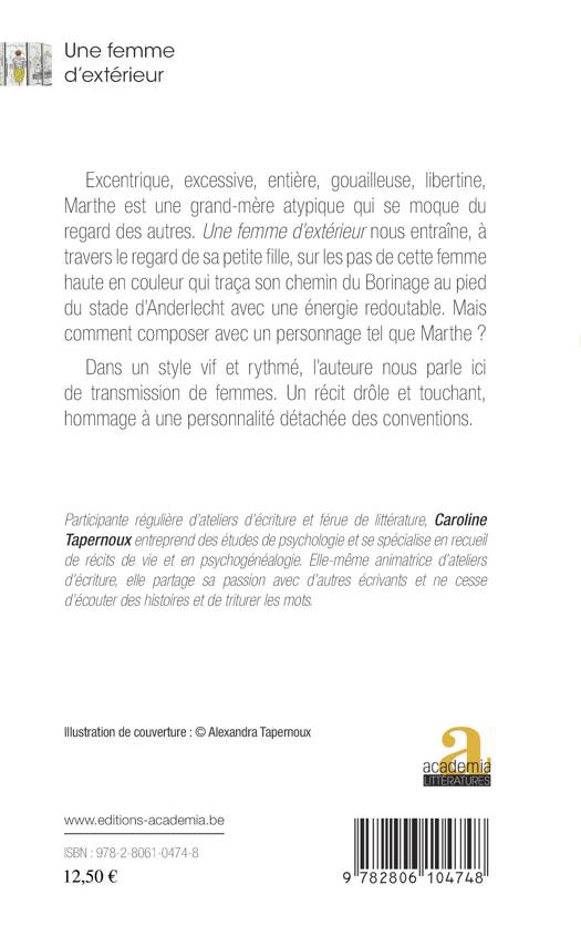Excessive, entière, gouailleuse, libertine, Marthe est une grand-mère atypique qui se moque du regard des autres. Une femme d'extérieur nous entraîne, à travers le regard de sa petite fille, sur les pas de cette femme haute en couleur qui traça son chemin du Borinage au pied du stade d'Anderlecht avec une énergie redoutable. Mais comment sa famille composera-t-elle avec tant d'excentricité ?