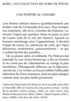Une femme solitaire observe quotidiennement une fenêtre vide de l'immeuble d'en face. Pour tromper son isolement, elle écrit, s'invente des histoires, caressant l'espoir que quelque chose se passe un jour de l'autre côté de la rue des Martyrs. Quand un homme emménage dans l'appartement, il devient l'objet de toutes les attentions de celle qui l'épie désormais tendrement, passionnément - et qui s'achète bientôt des jumelles... De sa plume sobre et entêtante, Pia Petersen fait entendre la voix d'une femme qui a élu un homme et ne craint pas de s'abandonner au vertige le plus mystérieux. Dérangeante réfl exion sur la dépossession de soi, Une fenêtre au hasard célèbre l'effroyable séduction du chaos amoureux, dans ses pires dangers comme dans ses plus belles promesses.