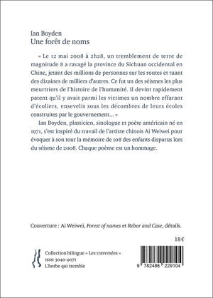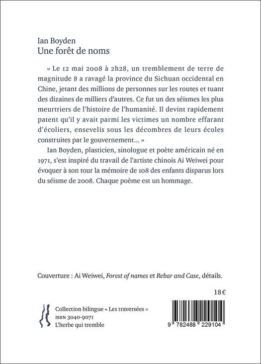 L’AUTEUR Ian Boyden, plasticien, sinologue et poète américain né en 1971, s’est inspiré du travail de l’artiste chinois Ai Weiwei pour évoquer à son tour la mémoire de 108 des enfants disparus lors du séisme de 2008. Chaque poème est un hommage.