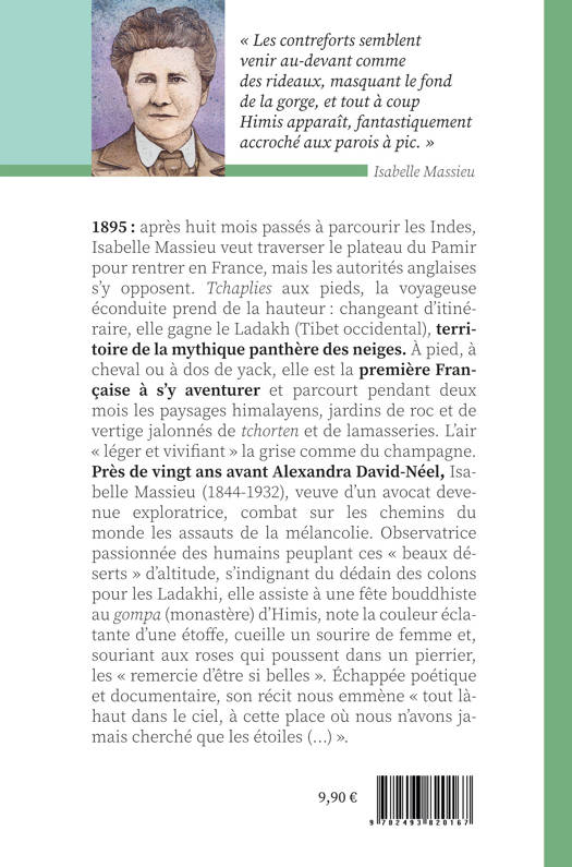1895 : après huit mois passés à parcourir les Indes, Isabelle Massieu veut traverser le plateau du Pamir pour rentrer en France, mais les autorités anglaises s'y opposent. Tchaplies aux pieds, la voyageuse éconduite prend de la hauteur : changeant d'itinéraire, elle gagne le Ladakh (Tibet occidental), territoire de la mythique panthère des neiges. À pied, à cheval ou à dos de yack, elle est la première Française à s'y aventurer et parcourt pendant deux mois les paysages himalayens, jardins de roc et de vertige jalonnés de chörtens et de lamaseries. L'air «léger et vivifiant» la grise comme du champagne. Près de vingt ans avant Alexandra David-Néel, Isabelle Massieu (1844-1932), veuve d'un avocat devenue exploratrice, combat sur les chemins du monde les assauts de la mélancolie. Observatrice passionnée des humains peuplant ces «beaux déserts» d'altitude, s'indignant du dédain des colons pour les Ladakhis, elle assiste à une fête bouddhiste au gompa (monastère) d'Hémis, note la couleur éclatante d'une étoffe, cueille un sourire de femme et, souriant aux roses qui poussent dans un pierrier, les «remercie d'être si belles». Échappée poétique et documentaire, son récit nous emmène «tout là-haut dans le ciel, à cette place où nous n'avons jamais cherché que les étoiles (...)».